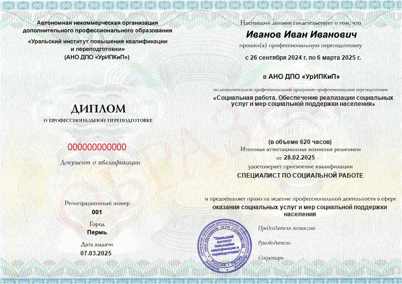 Да, дипломы и удостоверения оформляются в соответствии с действующим законодательством РФ. Документы печатаются на специальных бланках, заверяются печатью АНО ДПО «УрИПКиП».