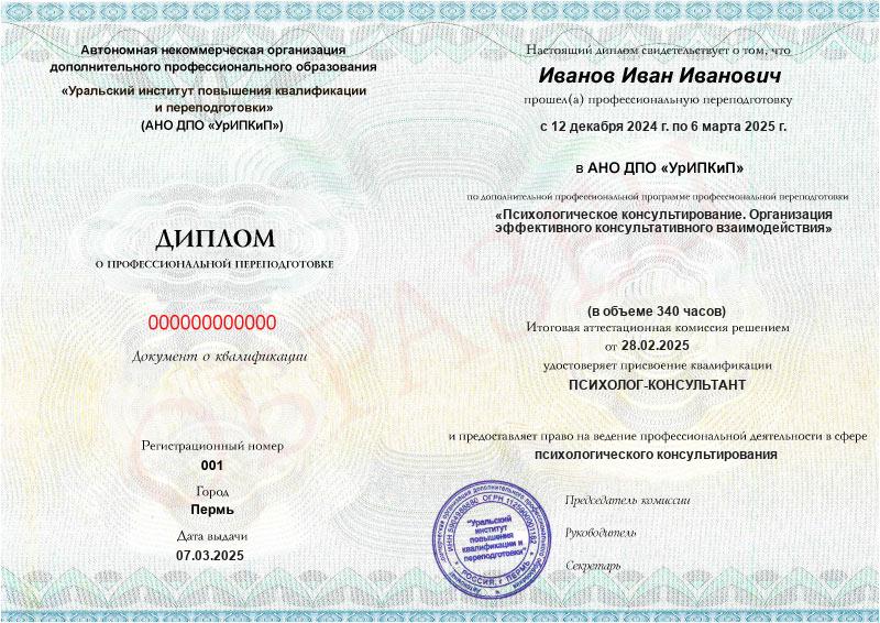 Да, дипломы и удостоверения оформляются в соответствии с действующим законодательством РФ. Документы печатаются на специальных бланках, заверяются печатью АНО ДПО «УрИПКиП».